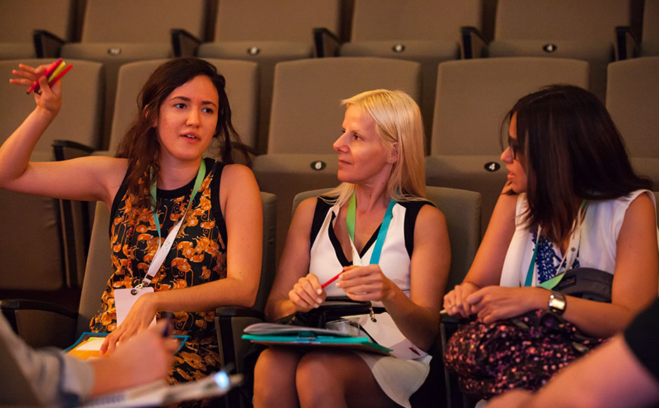 Julia Cavalcanti (ITS Rio), Leyla Keser, Founder and Director of the Istanbul Bilgi University IT Law Institute, and Stephane Hilda Barbosa, Researcher at the Getulio Vargas Foundation Law School in São Paulo (FGV/SP), converse during a cluster group session.