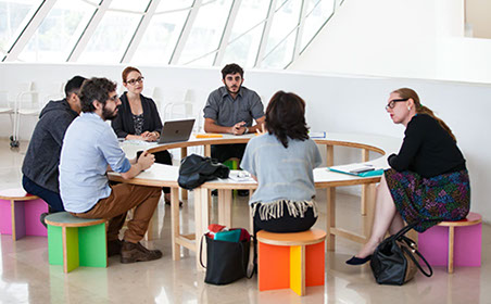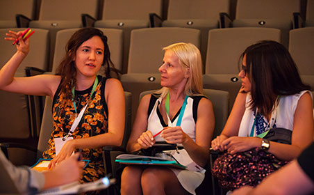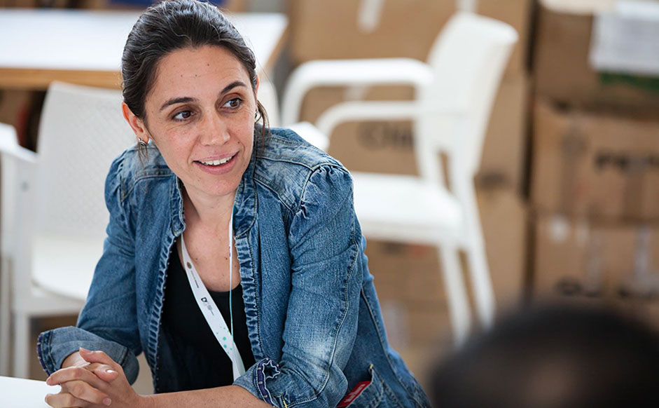 Agustina del Campo, director of the Center for Studies on Freedom of Expression and Access to Information (CELE), Universidad de Palermo, Argentina, engages with other members of a cluster group meeting.