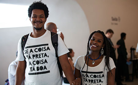 Lucas Santana, head of marketing at Evelle Consultoria & Desabafo Social, Salvador, Brazil, and Monique Evelle, CEO of Evelle Consultoria, walk together during a break on the second day of the symposium.