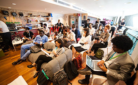 A cluster group meets on the second day of the symposium in the Museum of Tomorrow mezzanine to identify major challenges and opportunities of AI.