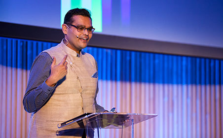 Keynote speaker Nishant Shah, Dean of Research at ArtEZ University of the Arts, Hamburg, Germany, speaks on inclusion in the age of AI. Shah called for considering human and technology factors together when trying to make AI more inclusive.
