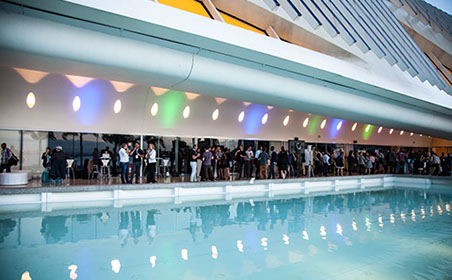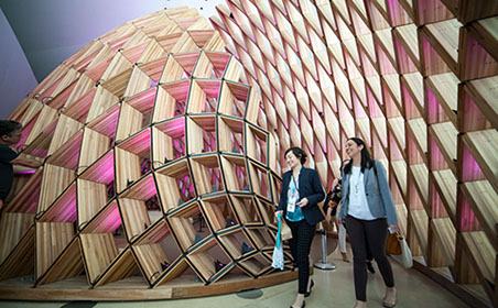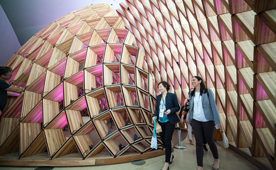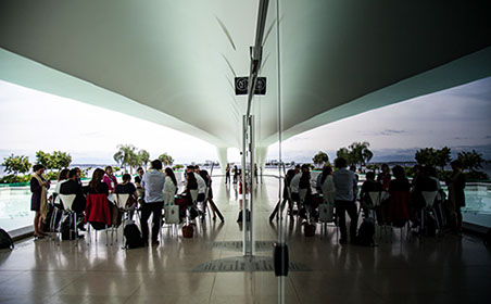 Two participants walk in the public section of the Museum of Tomorrow after the closing remarks.