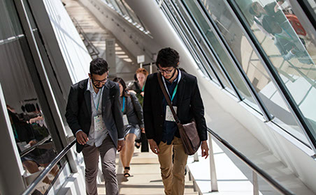 Participants walk from the main auditorium to a breakout session. Participants chose two breakout session themes out of ten total based on their interests and nature of work.